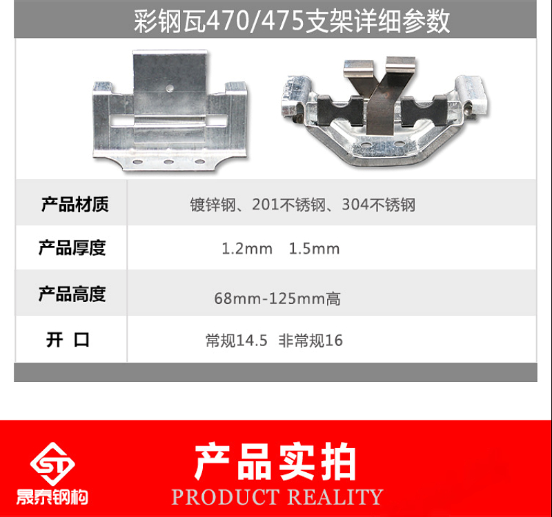 产品用处:支架的规格类型和彩钢板的规格类型匹配着运用,多用于大跨度的钢结构厂房,支架固定在檩条上,起到固定支撑屋面彩钢板的效果,相对于自攻钉,它具有可躲藏性,不易漏水并且受力好等长处。