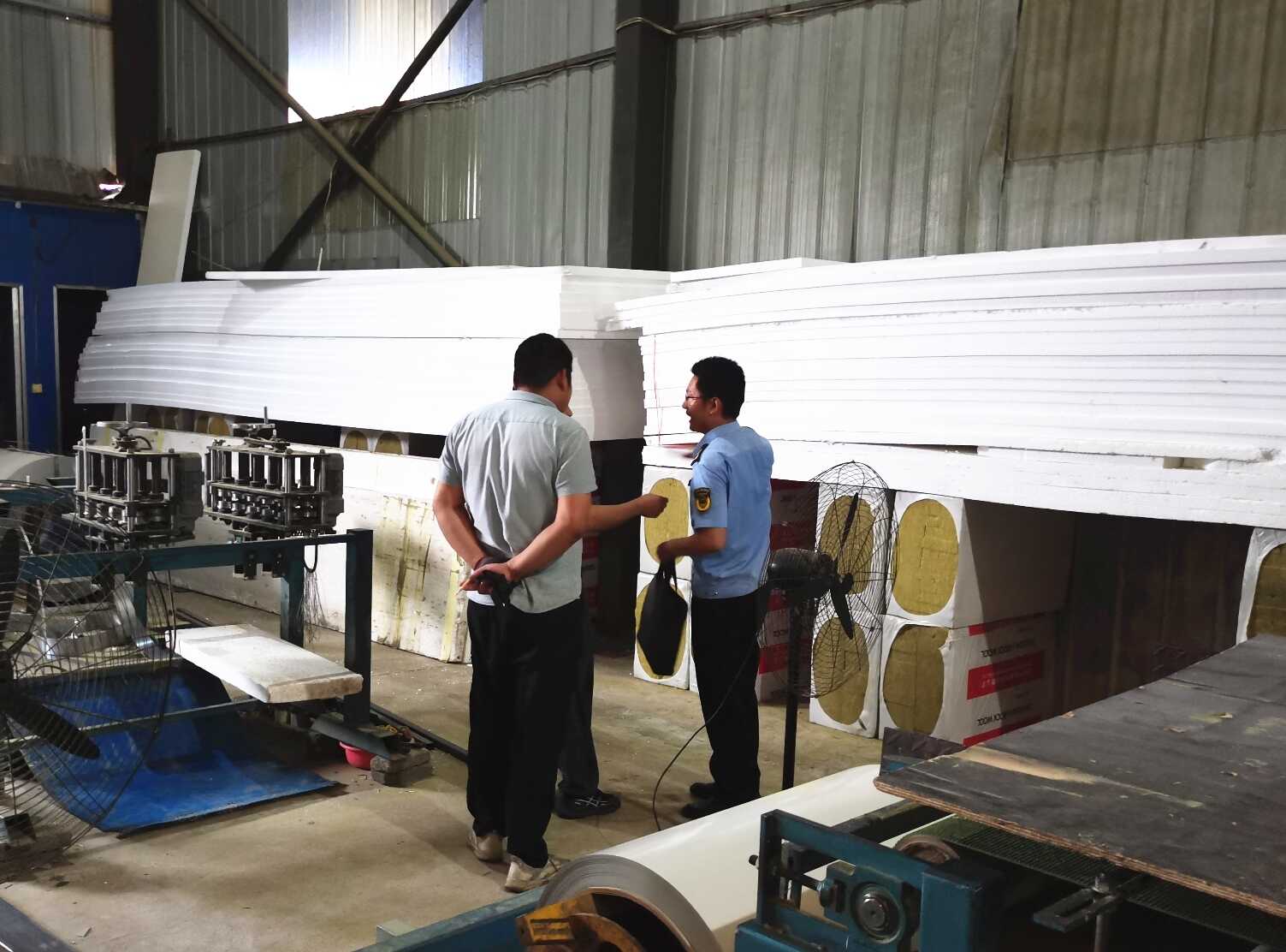 联合检查组先后前往湖北鸿恒净化科技有限公司、下陆区盛鑫彩钢夹芯板厂等3家建筑保温材料生产加工公司,了解公司制作经营情况,并对产品质量管控情况做现场检查,重点核查企业产品质量检验合格证明、标签标识、检测报告等是不是满足相关法律法规和国家标准要求,督促企业严把原材料进货关,加强过程质量控制,杜绝销售来源不明、不合格的建筑保温材料。针对部分产品标识不规范、未按规定落实出厂检验要求等问题,检查组督促企业限期进行整改。